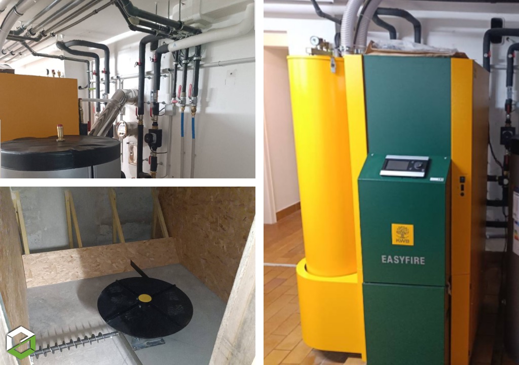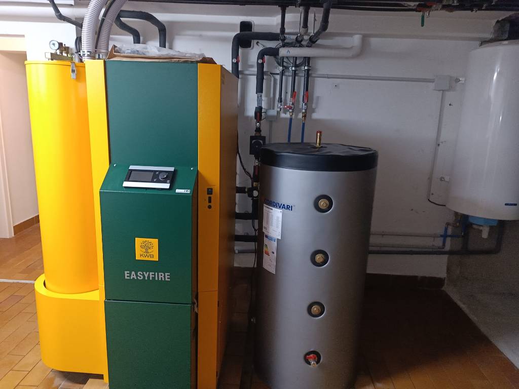 L’installation comprend un silo de stockage équipé d’un dessileur, assurant une alimentation automatique et régulière de la chaudière en granulés de bois. Pour optimiser le fonctionnement du système de chauffage, un ballon tampon a été mis en place afin de stocker l’énergie thermique produite et de garantir un rendement élevé.